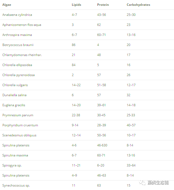 每種藻類提供不同比例的脂質(zhì)、淀粉和蛋白質(zhì),表1。有些藻類蛋白質(zhì)含量高,有些藻類主要是淀粉或脂質(zhì)。養(yǎng)殖方式的變化可能會(huì)極大地改變?cè)孱惖纳锪拷M成。