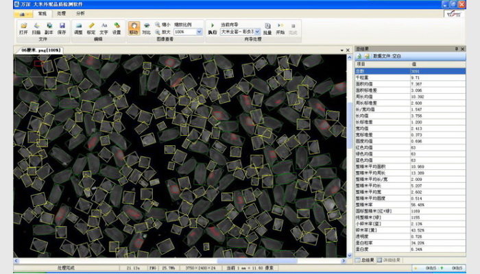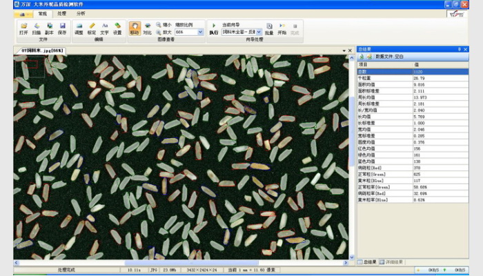3、自動測量每粒的面積、長徑、短徑、長寬比、圓度、等效直徑(長度測量誤差≤±0.05mm,長寬比測量誤差≤±0.05,重現(xiàn)性誤差≤±0.02;整精米率、碎米率指標測量誤差≤±1.0%、重現(xiàn)性誤差≤±0.25%)。