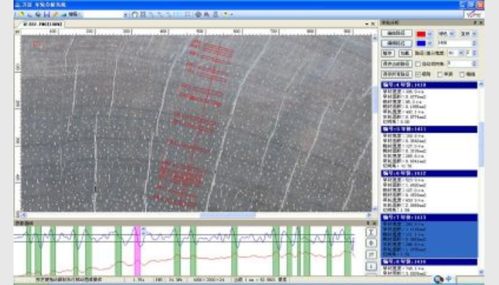 (2)可自動(dòng)劃分出年輪邊界、早材邊界、晚材邊界,以及識(shí)別出很窄的樹輪,可交互刪除偽年輪、插入斷年輪,可自動(dòng)生成分析年表。