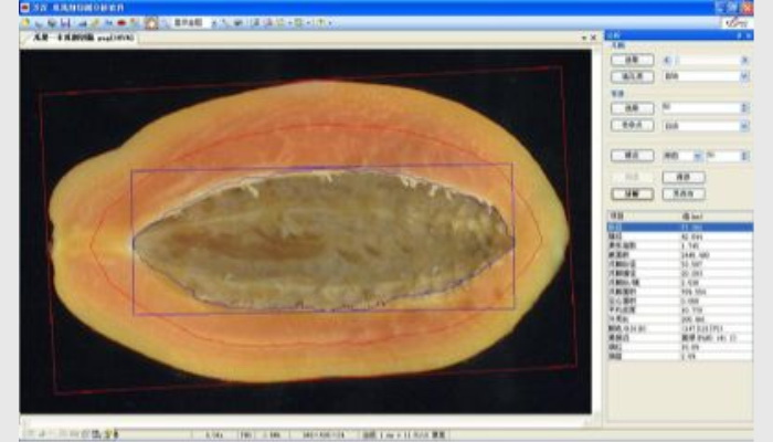 (2)可測(cè)哈密瓜等甜瓜的:縱徑、橫徑、果形指數(shù)、截面積、肉厚、外周長、瓤色分檔分析、種腔(縱徑、橫徑、面積)。